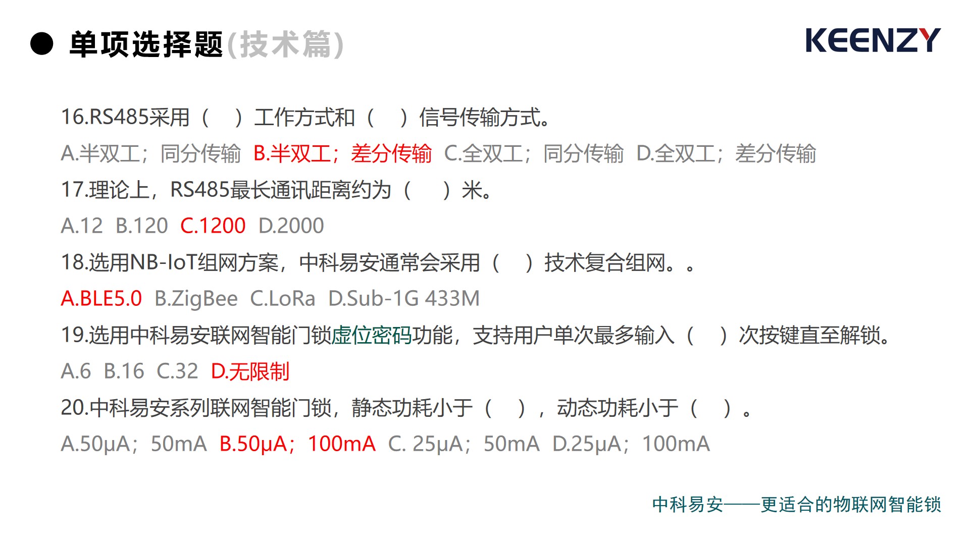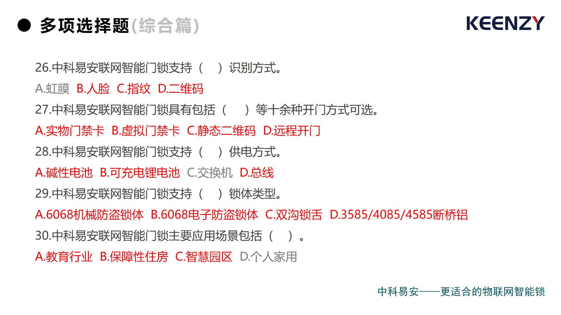 上周,中科易安發(fā)布了《聯(lián)網(wǎng)智能門鎖(學(xué)科 )》試卷,以中科易安聯(lián)網(wǎng)智能門鎖品牌、技術(shù)、綜合為視角,設(shè)置單項(xiàng)選擇題和多項(xiàng)選擇題兩大題型,累計(jì)30道題,現(xiàn)正式公布答案。